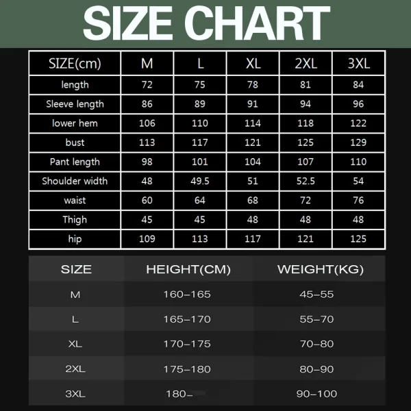 Height: 185-195cm, Weight: 90-105kg, Recommend Size: 3XL